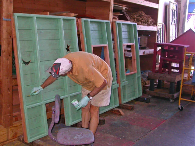 Along with the front wall of the Cozy Cabin, already built. All the carvings have been “chalked” on – just waiting for someone to hand-carve the images onto the redwood.